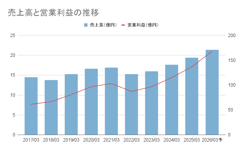 過去数年の売上高と営業利益の推移も見ておきましょう。