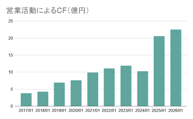 営業利益だけでなくキャッシュフローも伴って成長していることから、実際に現金もしっかり増えており、安定した収益基盤を持っていることが分かります。