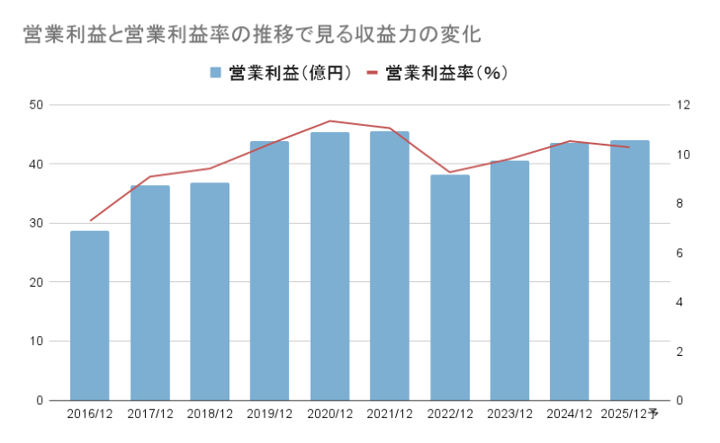 営業利益は2019〜2021年にかけて高水準となった後、2022年に一時落ち込みましたが、その後は回復し直近では40億円前後を維持しています。
