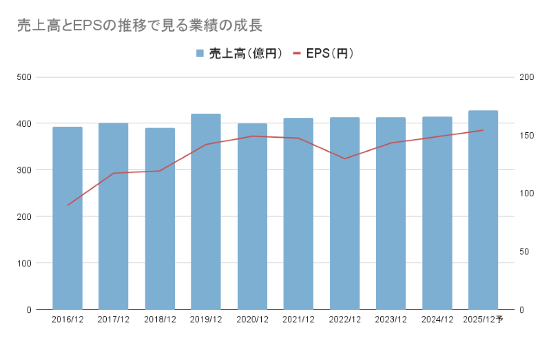 売上高は横ばいが続いており成長性は限定的ですが、EPSは直近で回復してきており、収益基盤の持ち直しが見られます。