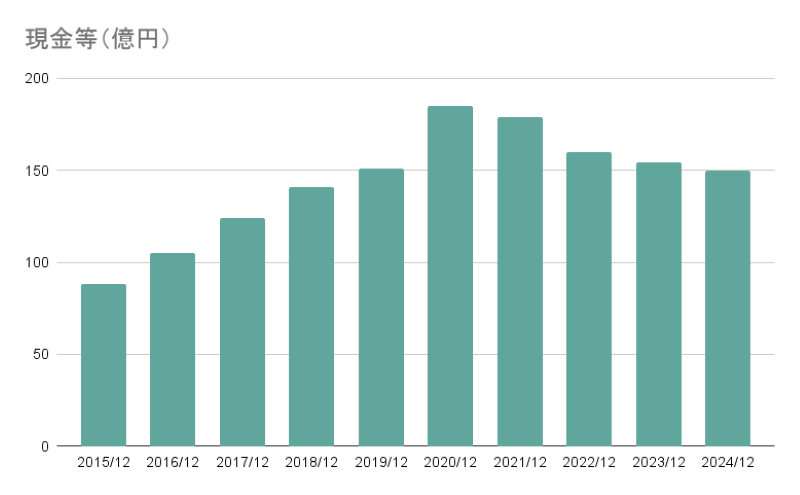 現金等は2020年にかけて大きく積み上がった後やや減少していますが、直近でも150億円前後と高水準を維持しています。研究開発や設備投資に活用されていると見られ、前向きな資金の使い方と言えそうです。